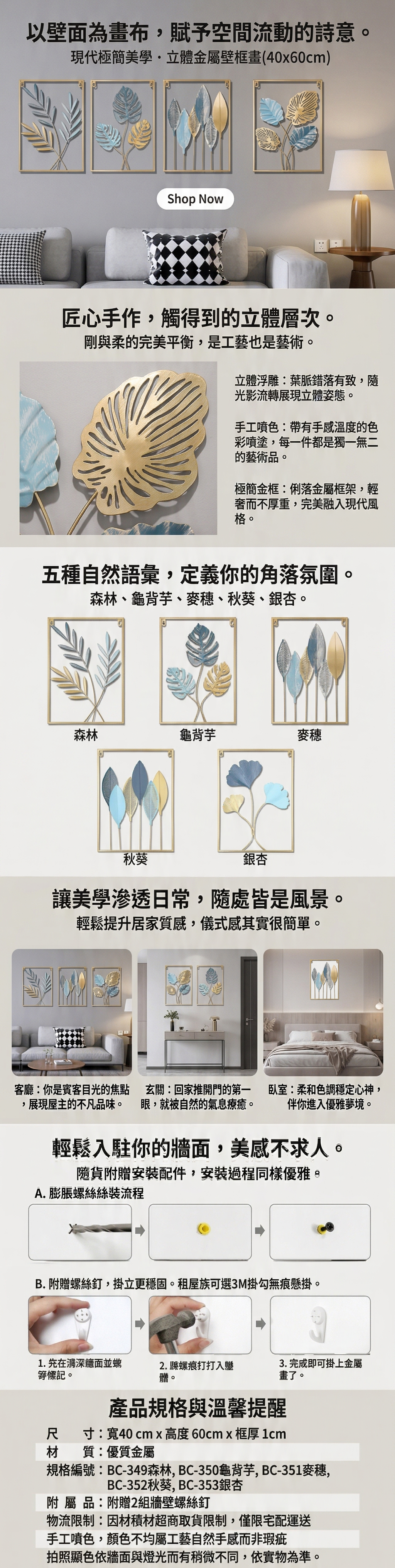 以壁面為畫布,金色的金屬框邊,立體的金屬植物葉片,繪上舒適柔和的色彩,讓居家生動活潑。