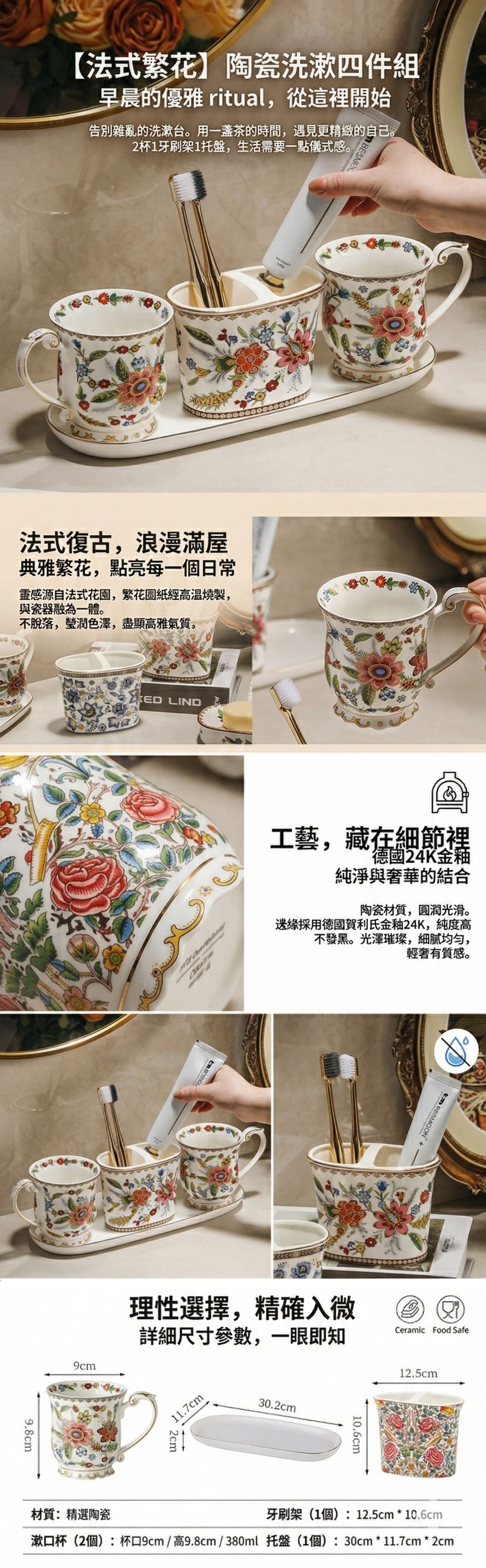 以典雅的法式繁花為設計的主視覺,陶瓷材質圓潤光滑,瑩潤色澤高雅氣質,無重金屬物質的法式花圖紙經過高溫燒製與瓷器融為一體不易脫落,邊緣採用德國賀利氏金釉24K,純度高不發黑,光澤璀璨細膩均勻,奢華有質感。