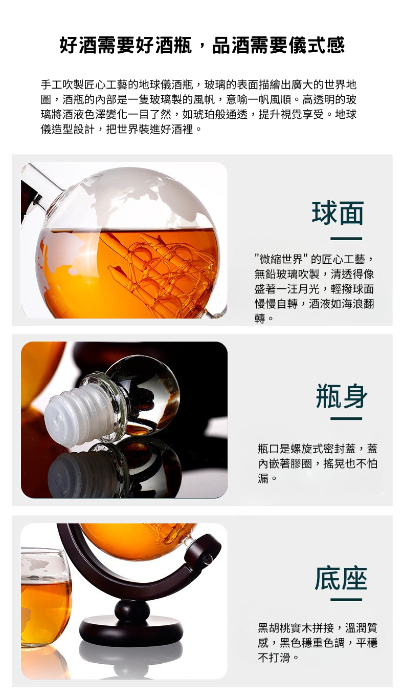 好酒需要好酒瓶,品酒需要儀式感。手工吹製匠心工藝的地球儀酒瓶,玻璃的表面描繪出廣大的世界地圖,酒瓶的內部是一隻玻璃製的風帆,意喻一帆風順。高透明的玻璃將酒液色澤變化一目了然,如琥珀般通透,提升視覺享受。地球儀造型設計,把世界裝進好酒裡。