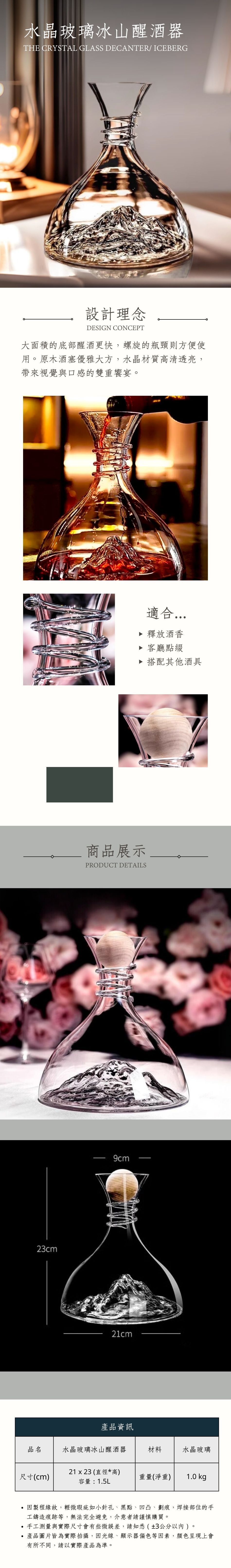 冰山醒酒器在注入葡萄酒時就是視覺享受,紅色的酒液沖擊在冰山上變化出美妙的色彩,底部大可以使葡萄酒接觸更多的氧氣醒酒快速,原木酒塞優雅大方,螺旋的瓶頸好拿好握,水晶材質高清透亮。