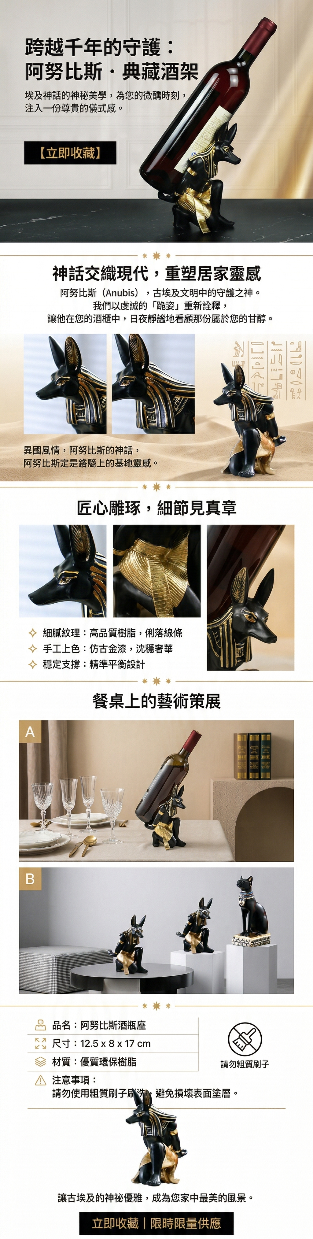 阿努比斯是古埃及神話中的死神,一位與木乃伊製作有關的獸首之神,以胡狼頭人身的形象在法老的葬墓壁畫中出現。以其跪姿作為酒瓶架的設計,特別具有異國風情的風味。