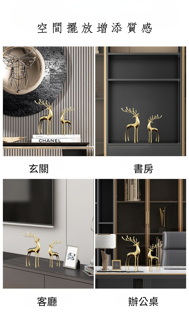 黃銅材質經過職人多道工序手工打磨,展現表面細緻光亮的高貴質感,挺立站姿的銅鹿展現昂首向前的正向力量,鹿音同<祿>,意味著俸祿不斷,財源滾滾,也有著吉祥長壽的象徵,在西方文化中,雄鹿有權力及高貴的象徵,也有愛情的象徵,能為人帶來幸福及長壽。