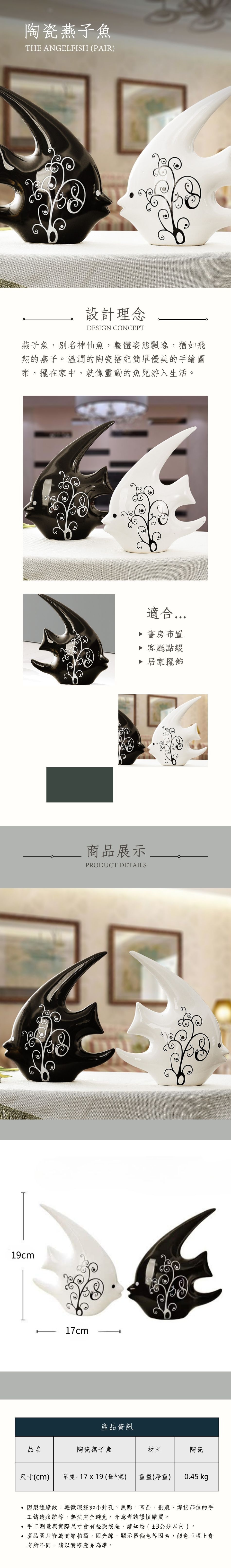 燕子魚並沒有艷麗的色彩,但它們奇特體型吸引了很多觀賞魚愛好者。燕子魚也叫神仙魚,是唯一可以「飛行」的魚,與飛魚的滑翔不同,它們在飛行的時候快速地擺動胸鰭,看起來特別飄逸美麗。 陶瓷燒製的燕子魚,溫潤的材質搭配美麗的形體和簡單的手繪圖案,清爽又舒服的家飾品。