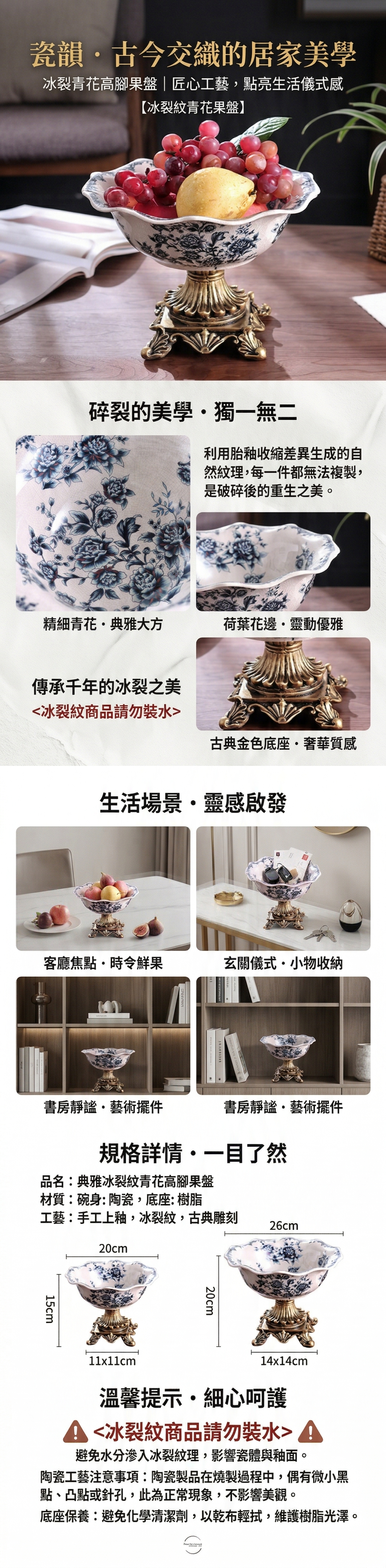 冰裂紋是通過控制瓷器胎體和瓷器表面釉層的物質成分,經過焙燒後冷卻,使得釉層的收縮大於胎體的收縮,釉面因此出現開裂,成為瓷器的一種特殊的裝飾。 金典青花的釉彩燒製,荷葉花邊設計,古典的金色高腳座,典雅大方。