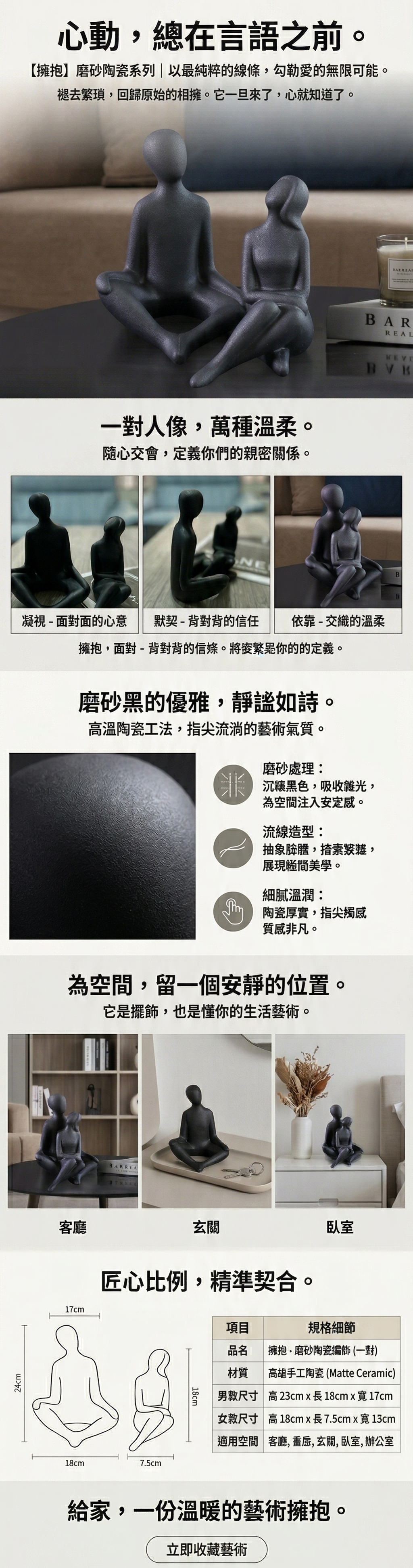 愛情的發生毫無道理,愛情,它一旦來了,心、就先知道了。以陶瓷製作的的擁抱情侶,表面以磨砂的工法處理,磨砂黑的優雅光澤展現藝術氣質。正坐和斜坐的情侶,以不同的姿態呈現,無論懷抱、相對、甚至背對,都展現不同的風貌。