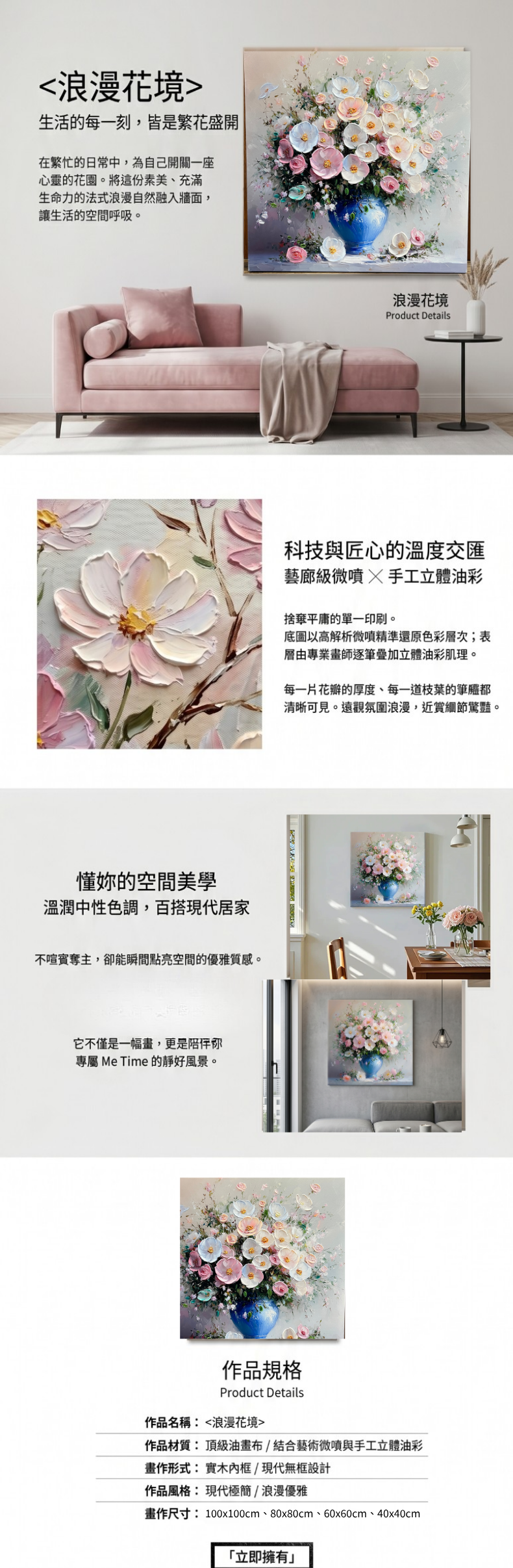 【浪漫花境】法式浪漫花境 半手工立體肌理無框油畫,讓一幅好畫,成為生活裡最美的風景。渴望在家中也能感受到微風拂過花園的浪漫嗎?這幅「浪漫花境」油畫以柔美的粉白雙色花朵為主調,搭配沉靜的湛藍陶瓷花瓶與散落的輕柔花瓣,將盛開的生命力與歲月靜好完美揉合。溫潤而中性的色調,為您的空間注入一股優雅而不具侵略性的溫馨氣息。