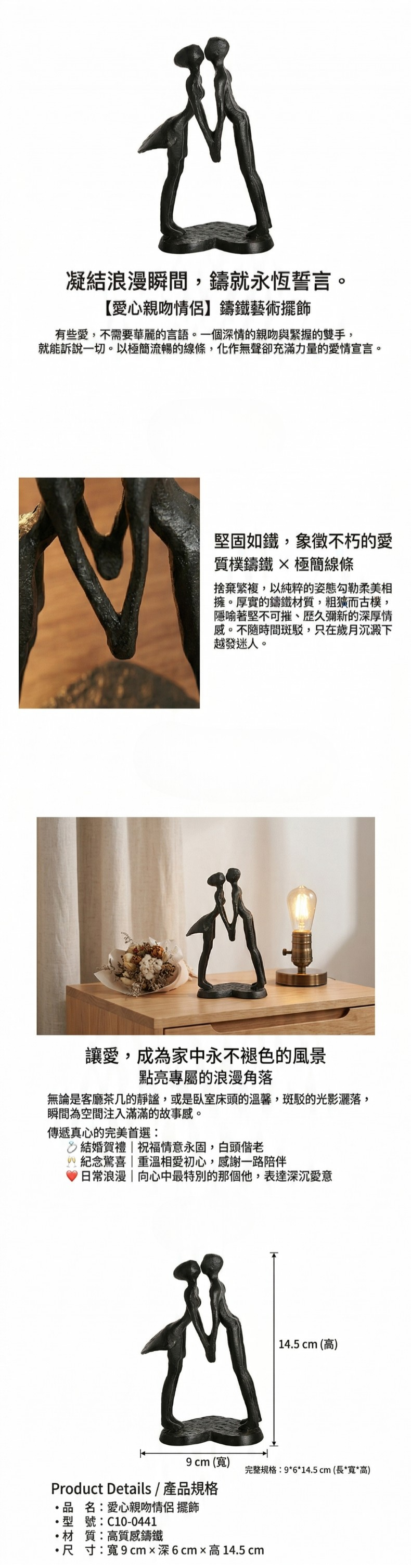 粗獷而古樸的鐵器紋理,與戀人柔美的姿態形成巧妙的對比;而鑄鐵本身的沉穩與重量,更隱喻著兩人之間堅不可摧、歷久彌新的深厚情感。它不會隨著時間斑駁,只會在歲月的沉澱下越發迷人。