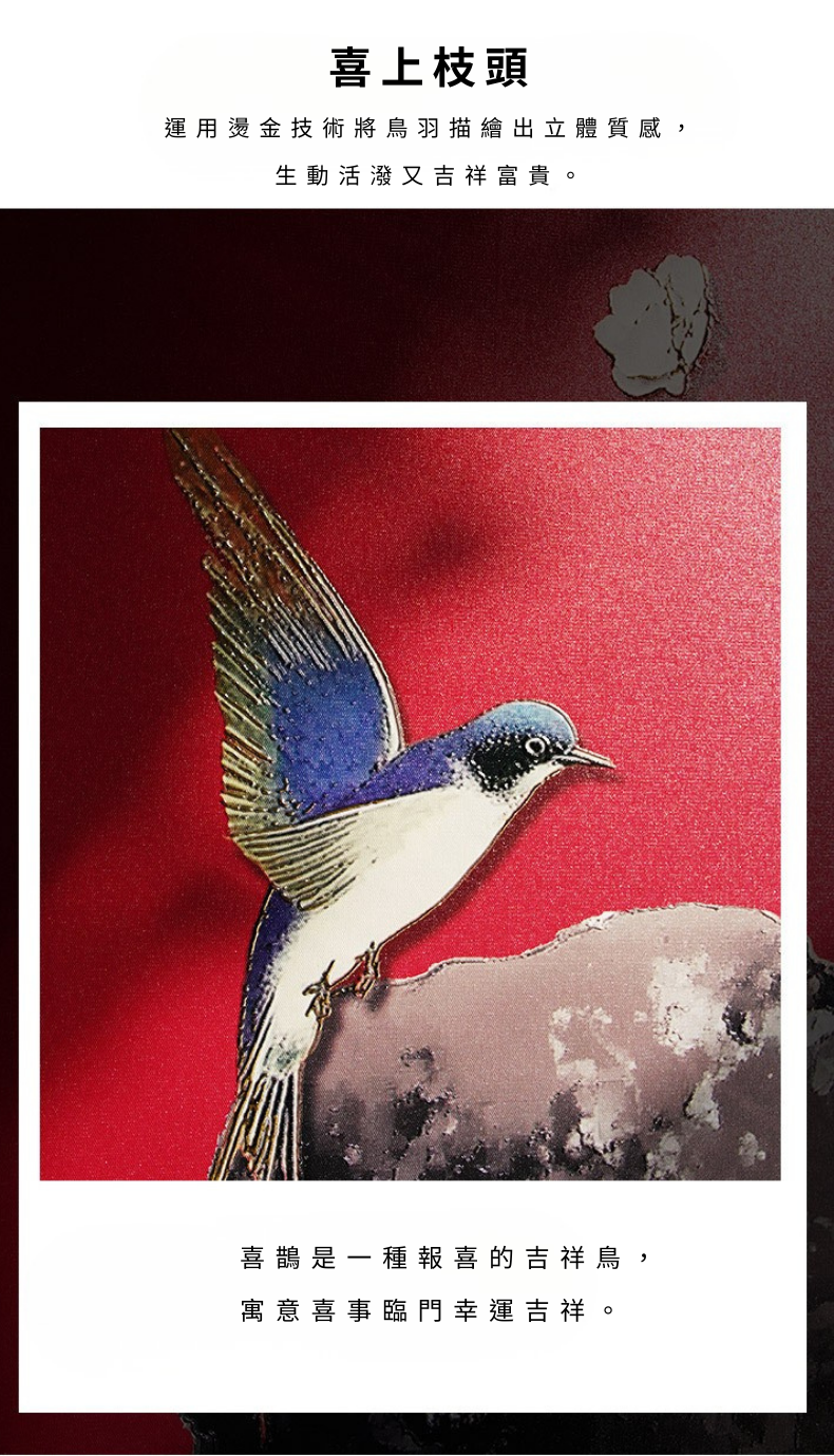 立體肌理繪畫加上燙金技術描繪展現細膩的質感。專業畫布耐汙不易褪色,微噴技術加上手繪的工藝結合,黑色拉絲紋理的鋁合金邊框,讓畫作更顯氣質。