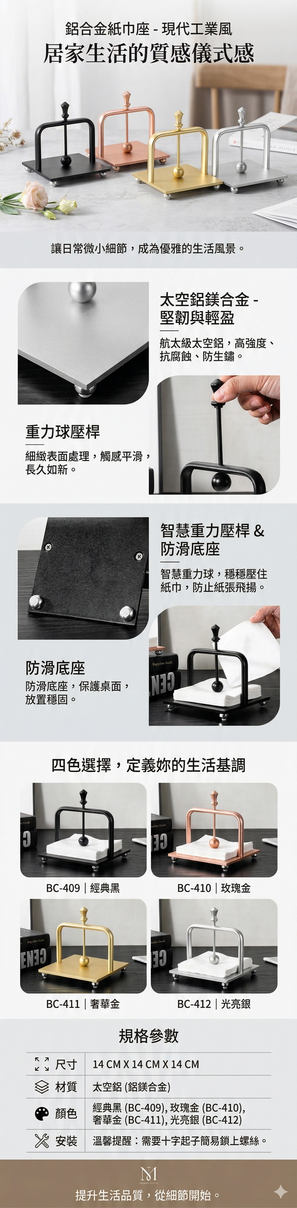 由太空鋁製造而成,具備簡約現代工業風格的紙巾座。太空鋁是一種高强度和耐腐蝕的鋁鎂合金材質,輕巧耐用又防生鏽。 有4種顏色可選擇,包含經典黑、玫瑰金、奢華金和光亮銀,各有各的特色。 底部是防滑底墊放置桌面穩固不滑動。