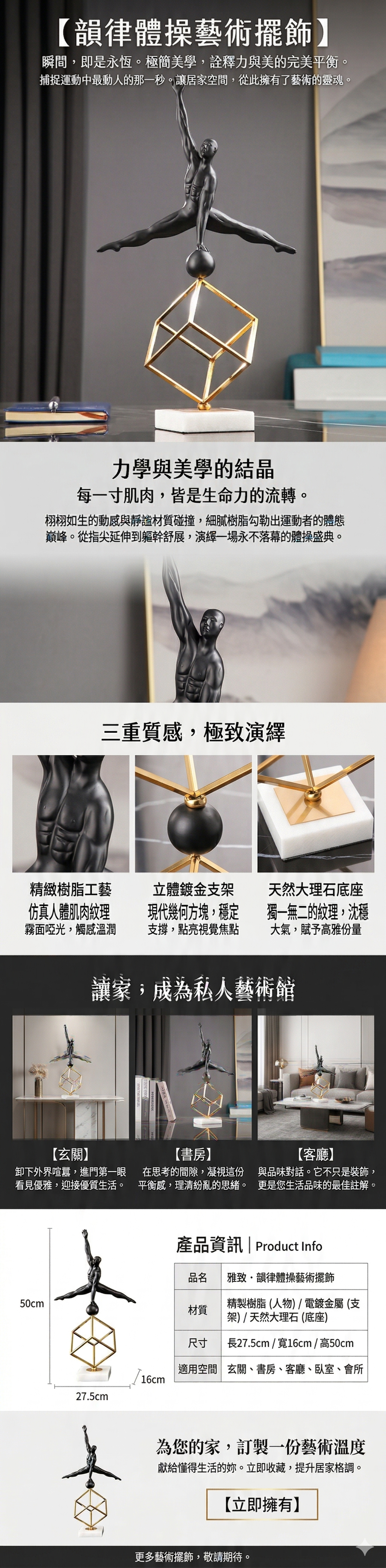 韻律體操雕塑作品,展現了韻律運動的人體美,對身體的律動、平衡和肌肉的延伸姿態,栩栩如生的動與靜的交融。 大理石底座高雅的紋路,搭配鍍金的立體金屬方塊支架,支撐起韻律體操選手的完美姿態。