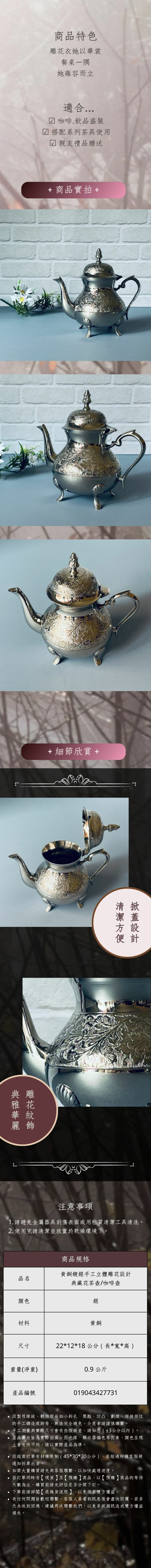 以黃銅手工做成的茶壺 / 咖啡壺,典雅的雕花藝術,與美麗的銀色相得益彰。