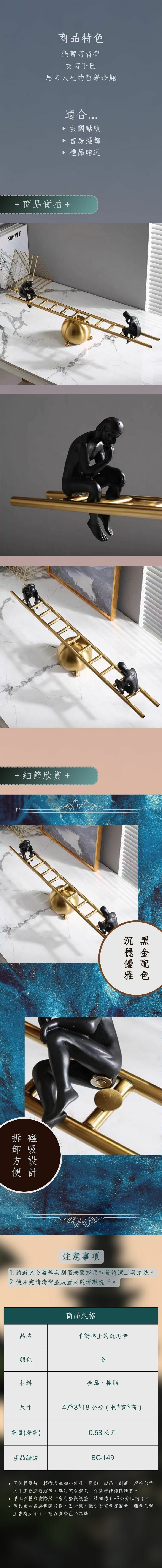 《沉思者》-俯著身、右手肘放在左大腿上,右手背支撐著下巴、顯露著一種深思、沈思的姿勢。 金色奢華的金色平衡梯和兩位肌肉線條和紋路自然寫實的沉思者,構成藝術氣息濃厚的居家擺飾品。