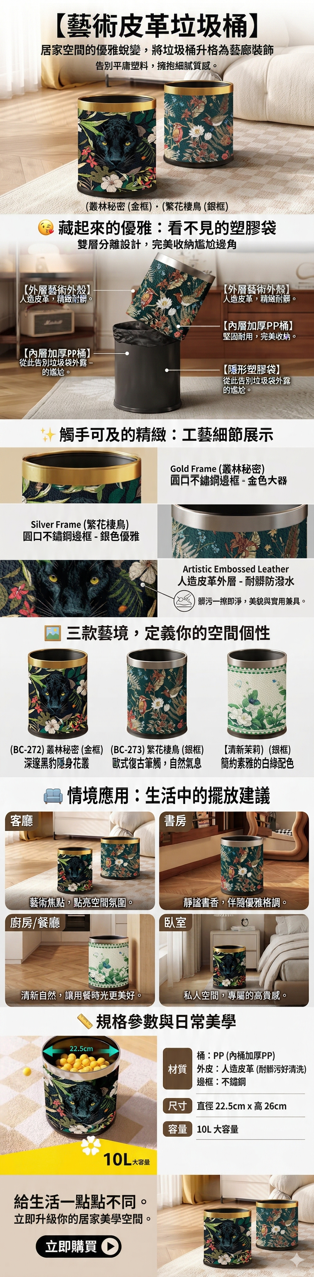 分離式雙層垃圾桶,將塑膠袋隱藏在裡面,內層是加厚的PP材質堅固耐用,外層是人造皮革印上美麗的圖畫,耐髒汙好清洗,上面圓口金色或銀色的不鏽鋼邊框,高雅大器。