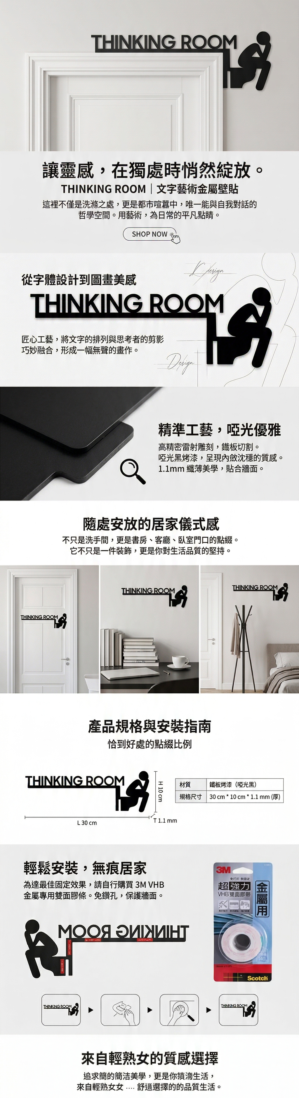 從字體的選擇、排列與設計,形成圖畫般的美感。並以雷射雕刻的工法在鐵板上切割而成,再烤上啞光黑的優雅色澤。