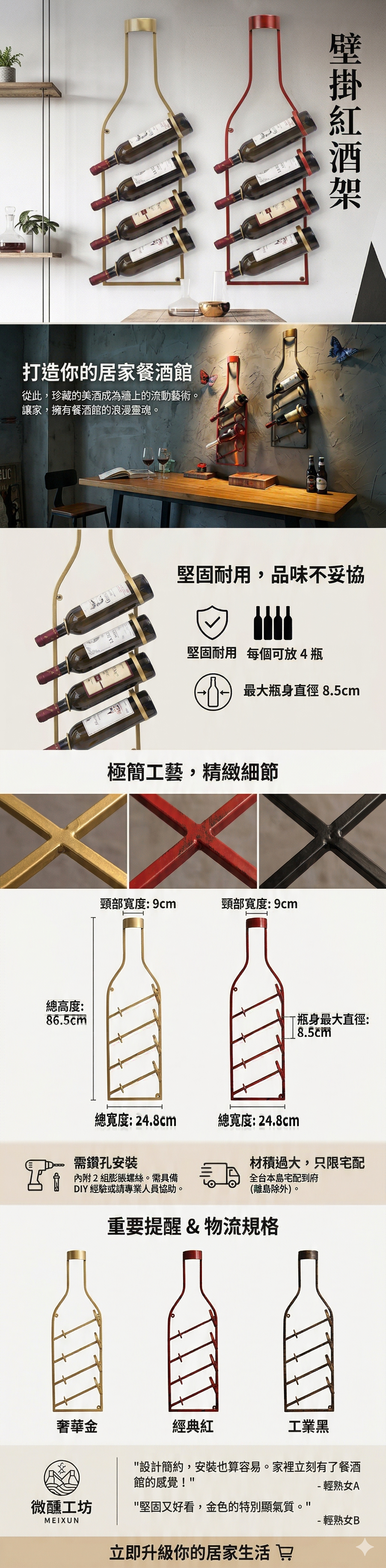 鐵製壁掛紅酒架堅固耐用,營造居家吧台或餐廳慵懶的美好時光。